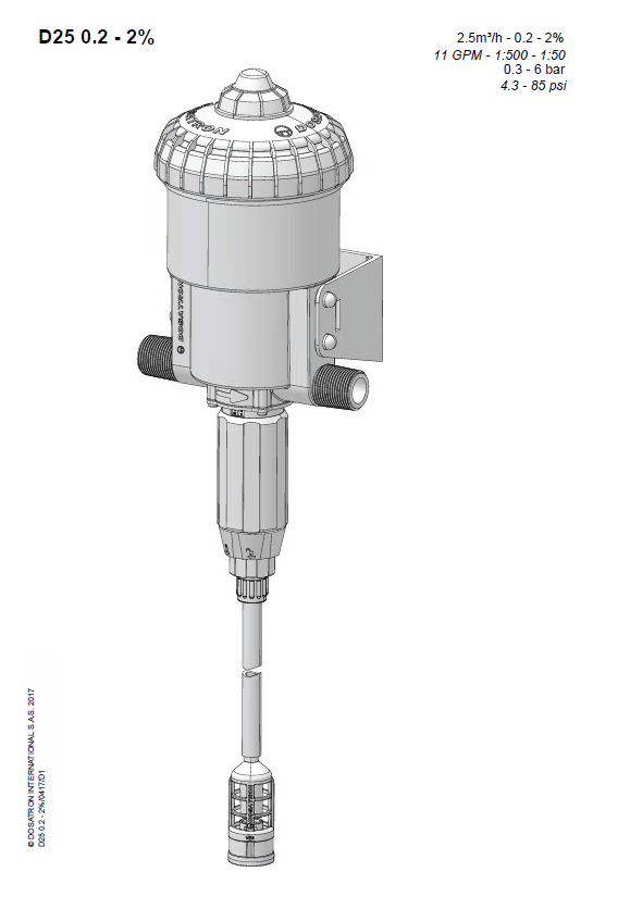 Принцип работы: Подключенный в сеть воды, дозатор использует давление воды в качестве единой движущей силы. Будучи в действии таким образом, он вовлекает концентрированный продукт, дозирует с необходимым процентным содержанием, а затем перемешивает с водой в системе. Полученный раствор двигается вниз по системе. Доза впрыскиваемого продукта всегда пропорциональна объему проходящей через дозатор воды, независимо от колебаний расхода или давления в сети.
