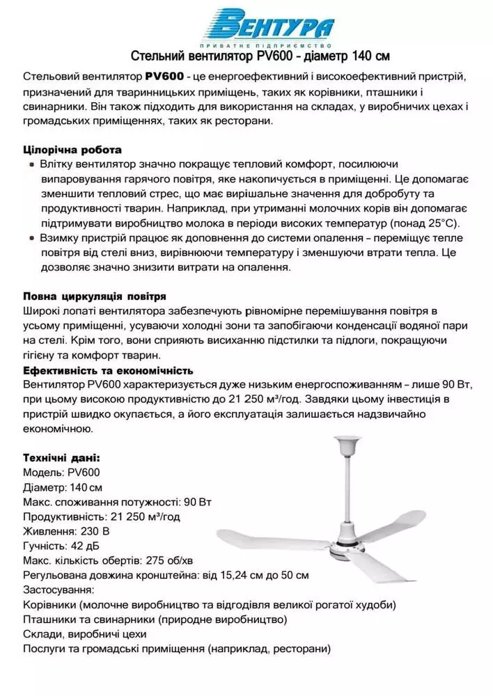 Потолочный вентилятор PV600 – это энергоэффективное и высокоэффективное устройство, предназначенное для животноводческих помещений, таких как коровники, птичники и свинарники. Он также подходит для использования на складах, производственных цехах и общественных помещениях, таких как рестораны.